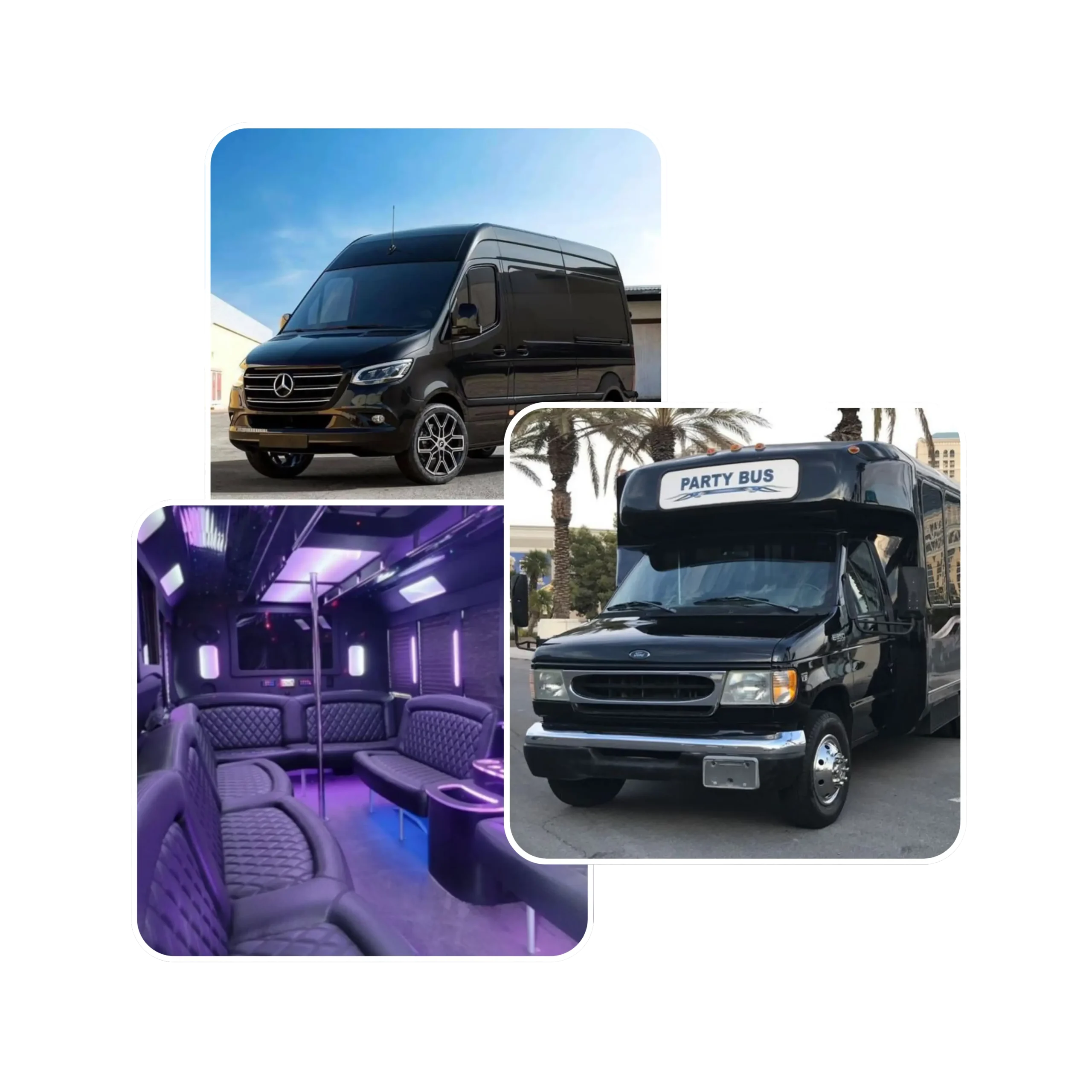 Bring the party on the road! Our fully equipped buses feature lights, music, and space to celebrate any occasion in style.
